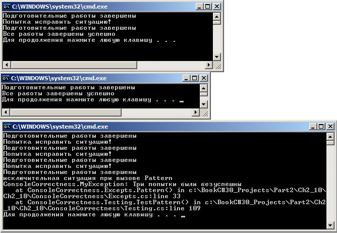 В одном из них исключительной ситуации при вызове метода Pattern вообще не возникало, в другом - ситуация возникала, но коррекция обработчика исключения помогла, и при повторе выполнения охраняемого блока в Pattern все прошло нормально. В третьем варианте метод Pattern не смог справиться с исключительной ситуацией, и она обрабатывалась в catch -блоке метода TestPattern.