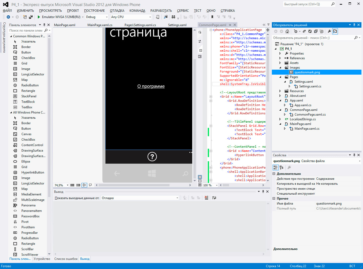 На копии экрана, кроме того, видно, что при выводе этой страницы не отображается системная строка состояния, расположенная по умолчанию в верхней части экрана. Мы скрыли её благодаря следующей настройке: shell:SystemTray.IsVisible="False".