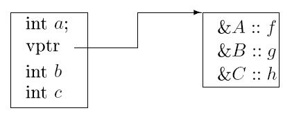 class A { public: int a; virtual void f(int); virtual void g(int); virtual void h(int); }; class B : public A { public: int b; void g(int); }; class C : public B { public: int c; void h(int); };