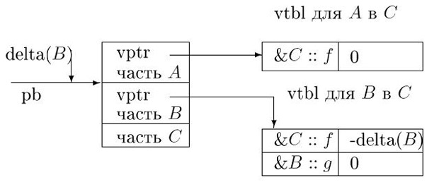 Рассмотрим, для примера, вызов pb -> f(). При входе в C :: f указатель this должен указывать на начало объекта C, а не на часть B в нем. Во время компиляции вообще говоря не известно, указывает ли pb на часть B в C. Например, из-за того, что pb может быть присвоен просто указатель на объект B. Так что величина delta(B), упомянутая выше, может быть различной для разных объектов в зависимости от структуры классов, порождаемых из B и должна где-то хранится во время выполнения.