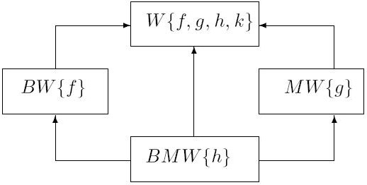 class W { public: virtual void f(); virtual void g(); virtual void h(); virtual void k(); }; class MW : public virtual W { public: void g(); }; class BW : public virtual W { public: void f(); }; class BMW : public BW, public MW, public virtual W { public: void h(); };