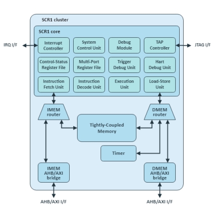 - Мосты для внешних AXI/AHB интерфейсов памяти инструкций и данных (IMEM/DMEM AXI/AHB bridge).