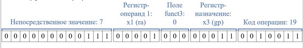 Рассмотрим декодирование арифметической инструкции I-типа на примере инструкции "addi gp, ra, 7".