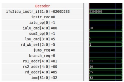 - Вычисление адреса чтения (ra+32) происходит без использования основного АЛУ, а с помощью отдельного сумматора "sum2", по данной причине ialu_cmd = 0.