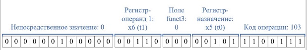 Рассмотрим декодирование инструкции безусловного ветвления (прыжка) I-типа на примере инструкции "jalr t0, t1". В данном случае смещение относительно адреса в t1 отсутствует, по этой причине imm = 0.