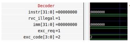 - При попадании такой инструкции в декодер, сначала она будет воспринята, как RVC инструкция c.addi4spn, так как операционный код и поле funct3 заполнены нулями. Но из-за нулевого непосредственного значения будет сгенерирован флаг "rvc_illegal".