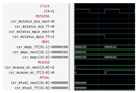 - В поле EC регистра MCAUSE будет записан код исключения (csr_mcause_ec_ff = 2).