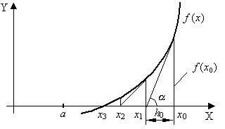 Метод Ньютона основан на замене исходной функции f(x), на каждом шаге поиска касательной, проведенной к этой функции. Пересечение касательной с осью Х дает приближение корня (Рис. 4.8).