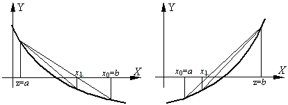 Метод обеспечивает быструю сходимость, если f(z)f"(z) > 0, т.е. хорды фиксируются в том конце интервала [a,b], где знаки функции f(z) и ее кривизны f"(z) совпадают.