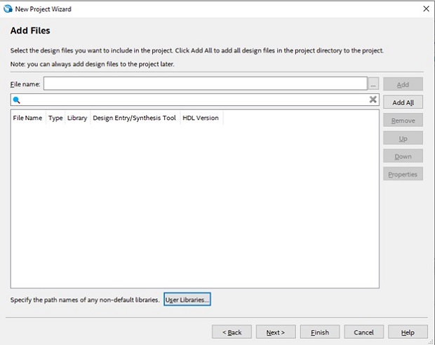 Далее NPW (рисунок 2.32) предложит добавить к проекту необходимые файлы сторонних библиотек или модулей. Имена выбираемых файлов, с указанием пути доступа к ним, появляются в основном окне второй страницы NPW. С помощью кнопок Add, Add All, Remove, Properties, Up, Down пользователь может добавить к своему проекту либо выделяемые им файлы по отдельности, либо сразу все файлы. Также он может удалить файлы, посмотреть их свойства, либо переставить местами. Порядок файлов имеет значение при компиляции проекта.