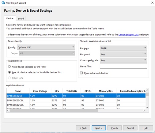 Для перехода к следующему окну NPW нажать кнопку Next. Вид открывшегося окна, представлен на рисунке 2.33. В этом окне пользователь выбирает микросхему программируемой логической интегральной схемы (ПЛИС), на которой будет реализован проект. В случае выбора кристалла пользователем, следует вначале выбрать его семейство в окне Family, затем определить тип корпуса интегральной схемы в поле Package. В поле Pin Count указать количество выводов кристалла, а в окне Speed grade указать градацию быстродействия кристалла. Затем остается выбрать подходящий кристалл из списка в разделе Available Devices, и с помощью кнопки Next перейти к следующему окну NPW, показанному на рисунке 2.34. На рисунке 2.33 приведен пример задания типа кристалла ПЛИС Cyclone IV EP4CE6E22C8.