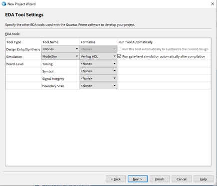 В следующем окне NPW пользователь может определить средства автоматизации проектирования, которые он планирует использовать для ввода проекта, синтеза, моделирования или временного анализа. В последующем эти средства будут вызываться непосредственно из пакета Quartus.