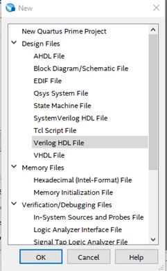 Для описания дешифратора необходимо кликнуть левой кнопкой мыши по "File" на панели меню Quartus. В открывшемся окне выбрать Verilog HDL File (рисунок 2.36).