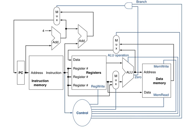 Если в программе есть ветвления, такие как условные операции (например, beq - branch if equal), значение PC будет изменяться не на постоянной основе, а в зависимости от результата операции. На рисунке данный блок обозначен как Branch.