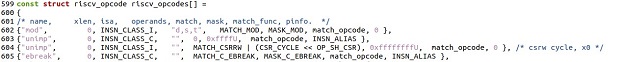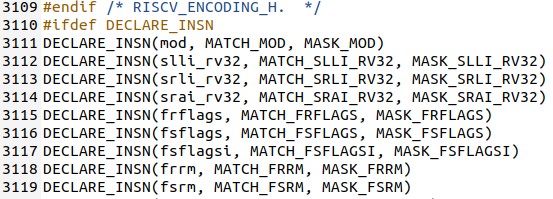 #define MATCH_MOD 0x200006b #define MASK_MOD 0xfe00707f ... DECLARE_INSN(mod, MATCH_MOD, MASK_MOD)