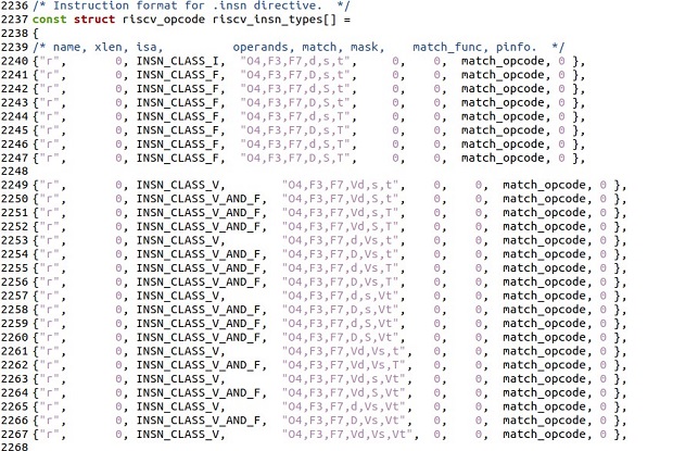 Далее в файле riscv-gnu-toolchain/riscv-binutils-gdb/opcodes/riscv-opc.c нужно объявить новую инструкцию, используя определенный набор параметров