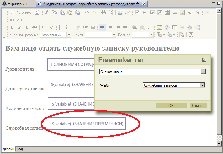 Для того, чтобы поместить ссылку на форму, через которую можно будет скачать служебную записку, надо использовать тег "Скачать файл"