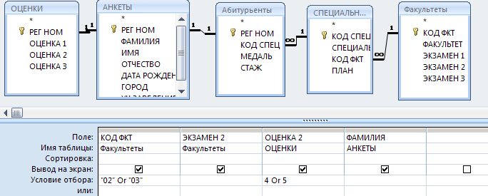 Как вы могли заметить в поле КОД_ФКТ, тоже стоит условие, т.к. физику сдавали на трех факультетах, и добавлены две лишние таблицы, чтобы не нарушать связь. Результат представлен на рис. 11.10.
