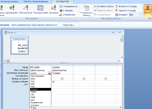 5. Найдите Количество абитуриентов набравших 14 баллов. Для этого необходимо применить групповые операции, и в зависимости от условий для каждого поля, следует выбрать из списка необходимую функцию ( рис. 11.13).