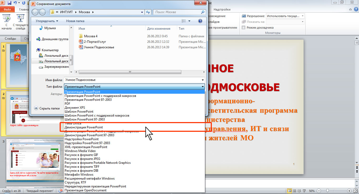 - В раскрывающемся списке Тип файла выберите Демонстрация PowerPoint, при необходимости в поле Имя файла введите имя файла, после чего нажмите кнопку Сохранить.