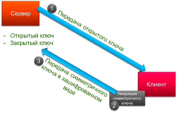 При обращении клиента к серверу по защищенному каналу сервер хранит открытый и закрытый ключ. В начальный момент времени сервер передает клиенту открытый ключ ассиметричного шифрования. Клиент случайным образом генерирует ключ симметричного шифрования и шифрует его с помощью открытого ключа, полученного от сервера. После этого клиент отправляет зашифрованный ключ на сервер и в этот момент времени клиент и сервер имеют одинаковые ключи для симметричного шифрования. Далее идет HTTP-взаимодействие, которое шифруется с помощью этого симметричного ключа. Симметричный ключ остается в секрете и не может быть перехвачен, поскольку закрытый ключ (которым можно расшифровать первое сообщение, содержащее симметричный ключ) остается в секрете на сервере. Таким образом, обеспечивается конфиденциальность и целостность передаваемых данных по протоколу HTTP