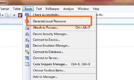 Для создания локальных ресурсов необходимо переключить режим редактирования страницы в режим "Design". После этого в главном меню "Tools" появится элемент "Generate Local Resource".