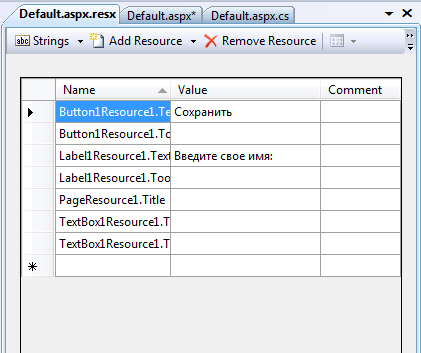 Локальные ресурсы – это особый тип ресурсных файлов, которые ассоциируются с конкретной страницей веб-приложения. Данные из файлов локальных ресурсов могут использоваться только на той странице, к которой привязан файл ресурсов. Файл ресурсов генерируется средой разработки и автоматически привязывается к элементам управления веб-формы.