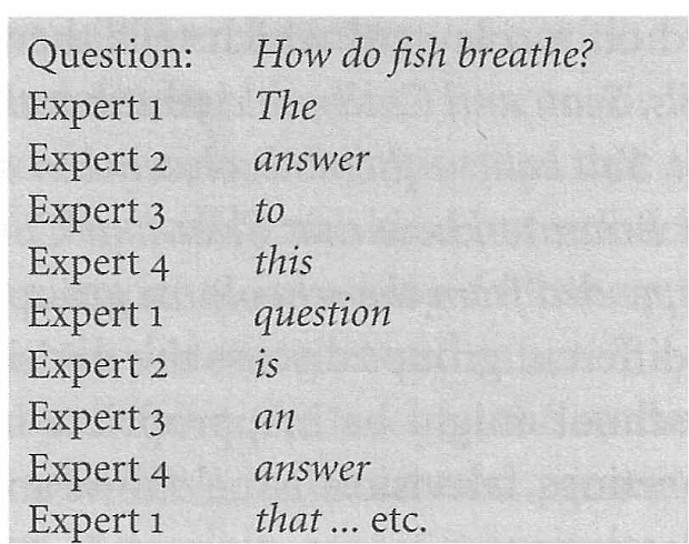 The class chooses four or five students to be a panel of 'experts'. They come and sit in a row facing the class. The class then chooses a subject that these students are going to have to be experts on. This can be anything, from transport policy to film music, from fish to football. In pairs or groups, the class write down the questions they want to ask the experts about this particular subject. The teacher can go round the class checking the questions as they do this. Finally, once the questions have been written, they are put to the experts. The element of this activity that makes it amusing is that each expert only says one word at a time, so the sentence is only gradually built up. Because the experts often can't think of how to continue it, it can ramble on in ever more extreme contortions until someone is lucky enough or clever enough to be in a position to finish it (with just one word). The following example shows how it might begin: