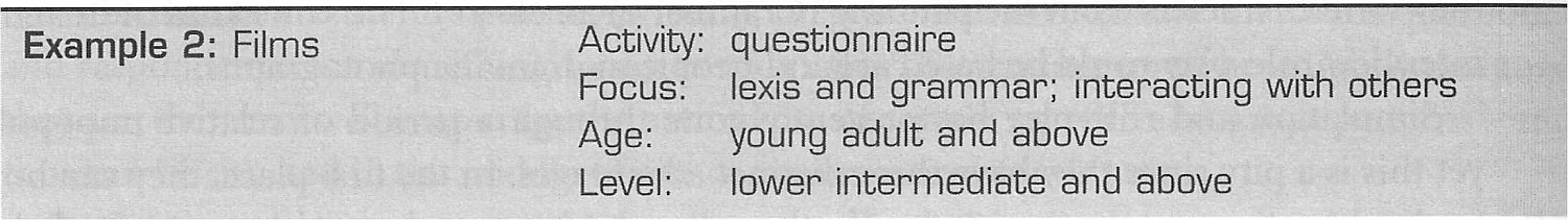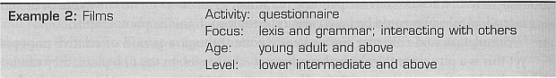 Questionnaires are often the first stage in much longer sequences, leading on to written reports and discussions. In this case, for example, students can use the questionnaire results for discussion or to write their own 'film page' for a real or imagined magazine.