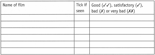 The activity starts when the teacher talks to the students about the five or six most popular films that are currently on show or which have been extremely popular in the last six months or a year. They are then told that they are going to find out which of these films is the most popular in the class. The teacher hands out the following questionnaire form - or writes it on the board and has the students copy it. They put the names of the films they have discussed in the left-hand column.