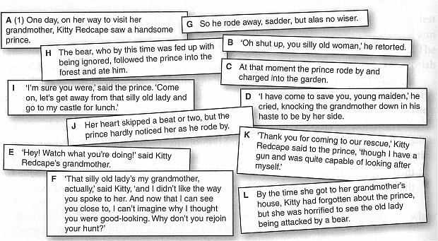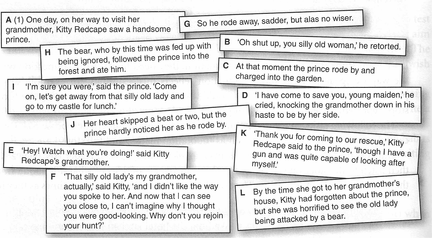 This sequence aims to make students aware of coherence - and especially cohesive devices - in writing. The students are told that they are going to reconstruct a text about Kitty Redcape, whose grandmother lives in the woods. Kitty frequently goes there to have tea. They are given a series of cards and told to re-order them to make a story (the first one is done for them). They need to look out for clues, such as the use of pronouns, repetition of lexical items and a coherent order of events. These are the cards they are given: