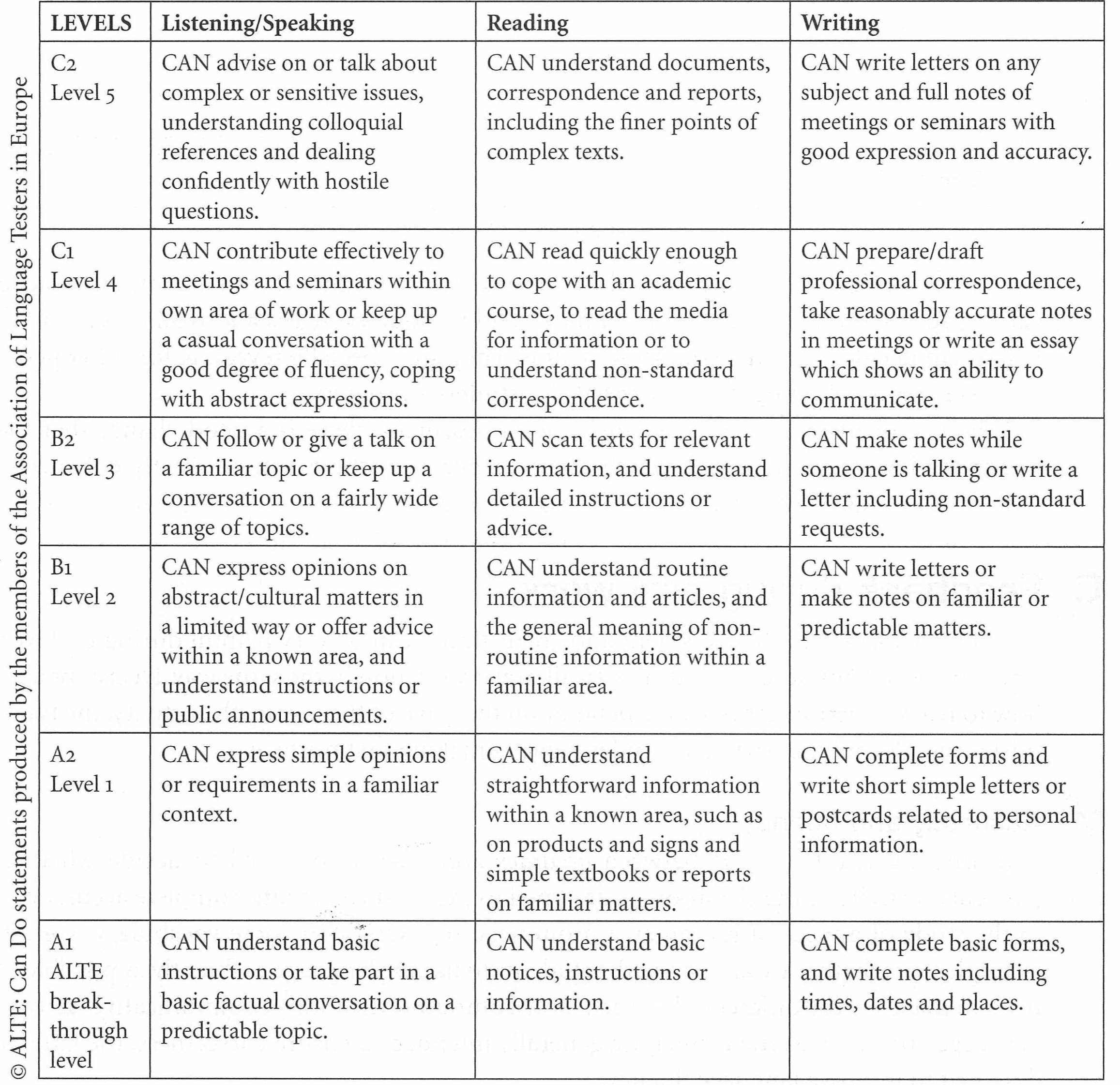 This kind of self evaluation is at the heart of the 'can do' statements from ALTE (Association of Language Testers in Europe) and the Common European Framework (CEF). Students - in many different languages - can measure themselves by saying what they can do in various skill areas. The ALTE statements for general overall ability (giving six levels from A1-C2), give students clear statements of ability against which to measure themselves: