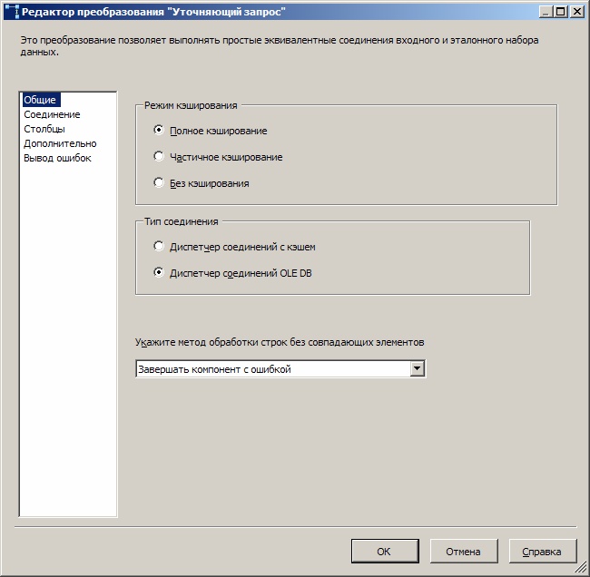 После того как настроен источник плоских файлов для извлечения данных из файла источника, следует определить преобразования "Уточняющий запрос", необходимые для получения значений " CurrencyKey " и " TimeKey ". Преобразование "Уточняющий запрос" выполняет поиск, соединяя данные указанного входного столбца со столбцом эталонного набора данных. Эталонным набором данных может быть таблица или представление, новая таблица или результат инструкции SQL. В данной лабораторной работе преобразование "Уточняющий запрос" использует диспетчер соединений OLE DB, чтобы подключиться к базе данных, содержащей данные, служащие источником для эталонного набора данных.