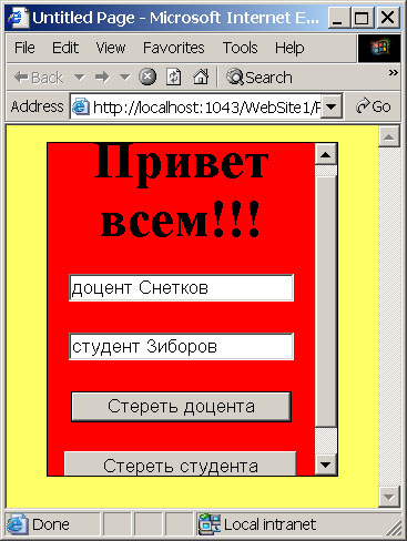 <%@ Page Language="C#" AutoEventWireup="true" CodeFile="PanelScroll.aspx.cs" Inherits="PanelScroll" %> <html xmlns="http://www.w3.org/1999/xhtml"> <head runat="server"> <title>Untitled Page</title> </head> <body bgcolor="#ffff66"> <form id="form1" runat="server"> <div style="text-align: center"> <asp:Panel ID="Panel1" runat="server" ScrollBars="Vertical" Height="300px" Width="261px" BackColor="Red" BorderWidth="1px"> <h1>Привет всем!!!</h1> <asp:TextBox ID="TextBox2" runat="server">доцент Снетков</asp:TextBox><br /> <br /> <asp:TextBox ID="TextBox1" runat="server">студент Зиборов</asp:TextBox> <br /> <br /> <asp:Button ID="Button1" runat="server" Text="Стереть доцента" /><br /> <br /> <asp:Button ID="Button2" runat="server" Text="Стереть студента" /></h1> </asp:Panel> </div> </form> </body> </html>