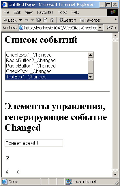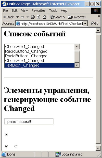 using System; using System.Data; using System.Configuration; using System.Collections; using System.Web; using System.Web.Security; using System.Web.UI; using System.Web.UI.WebControls; using System.Web.UI.WebControls.WebParts; using System.Web.UI.HtmlControls; public partial class CheckedChanged : System.Web.UI.Page { protected void CtrlChanged(object sender, EventArgs e) { // Добавим имя элемента, сгенерировавшего событие, в список string ctrlName = ((Control)sender).ID; ListBox1.Items.Add(ctrlName + "_Changed"); // Позиционирование на последний элемент списка ListBox1.SelectedIndex = ListBox1.Items.Count - 1; } }