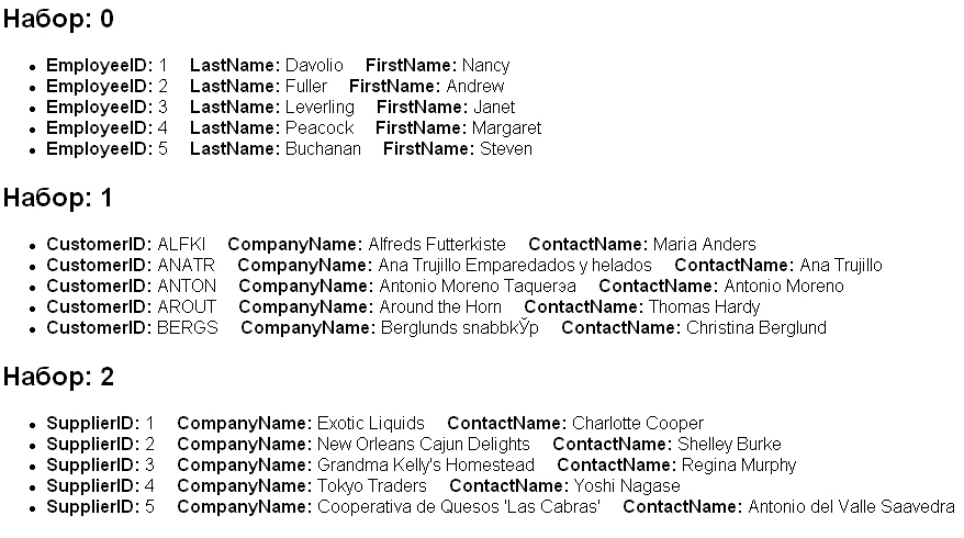 Заполните страницу приведенным кодом<%@ Page Language="C#" %> <script runat="server"> protected void Page_Load(object sender, EventArgs e) { // Извлекли строку соединения из web.config string connectString = System.Web.Configuration.WebConfigurationManager. ConnectionStrings["Northwind"].ConnectionString; // Создали объект соединения System.Data.SqlClient.SqlConnection con = new System.Data.SqlClient.SqlConnection(connectString); // Создали объект Command System.Data.SqlClient.SqlCommand cmd = new System.Data.SqlClient.SqlCommand(); // Настроили объект Command cmd.Connection = con; cmd.CommandType = System.Data.CommandType.Text; cmd.CommandText = "SELECT TOP 5 * FROM Employees;" + "SELECT TOP 5 * FROM Customers;" + "SELECT TOP 5 * FROM Suppliers"; System.Text.StringBuilder htmlStr = new StringBuilder(""); int i = 0; using (con) { // Открыли соединение con.Open(); // Выполняем команду и получаем результирующий набор данных System.Data.SqlClient.SqlDataReader reader = cmd.ExecuteReader(); // Перебираем частные наборы в результирующем наборе данных do { htmlStr.Append("<h2>Набор: ");// Заголовок h2 HTML htmlStr.Append(i.ToString()); htmlStr.Append("</h2>"); htmlStr.Append("<ul>"); // Начало маркированного списка // Перебираем все записи текущего набора // (их должно по команде быть 5 первых) // в результирующем наборе и строим HTML-строку while (reader.Read()) { htmlStr.Append("<li>");// Строка списка HTML // Перебираем все поля строки набора for (int field = 0; field < reader.FieldCount; field++) { if (field >= 3) // Ограничимся тремя первыми полями continue; htmlStr.Append("<b>"); htmlStr.Append(reader.GetName(field).ToString());// Имя поля htmlStr.Append(": </b>"); htmlStr.Append(reader.GetValue(field).ToString());// Значение поля htmlStr.Append(" ");// Жесткие пробелы HTML } htmlStr.Append("</li>"); } htmlStr.Append("</ul>"); // Конец маркированного списка i++; } while (reader.NextResult()); // Закрываем набор данных reader.Close(); } // Показываем пользователю результаты запроса lblInfo.Text = htmlStr.ToString(); } </script> <html xmlns="http://www.w3.org/1999/xhtml" > <head runat="server"> <title>Untitled Page</title> </head> <body> <form id="form1" runat="server"> <div> <asp:Label ID="lblInfo" runat="server" Text="Label"></asp:Label></div> </form> </body> </html> -