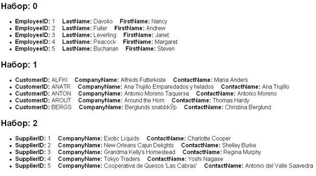 Приведенная строка содержит три запроса, каждый из которых возвращает в результирующий набор данных по пять первых записей из трех таблиц базы Northwind. Ниже приведен код страницы, в котором выполняется последовательная выборка данных из множественного результирующего набора. Переход на новый результирующий набор выполняется методом NextResult(), который возвратит false, когда больше не останется результирующих наборов.