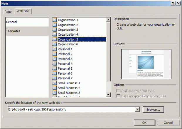 - В качестве шаблона в окне New выберем, к примеру Organisation5