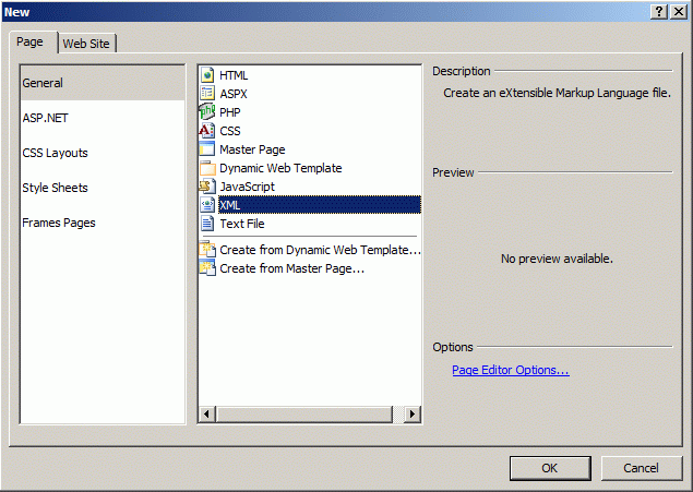 - Добавим xml - файл к данному веб - порталу, выбрав в меню File-New-Page.