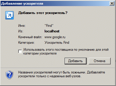 - Теперь нужно добавить созданный ускоритель в IE8. Для этого переходим на страницу default.html
