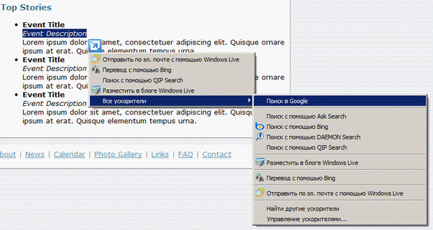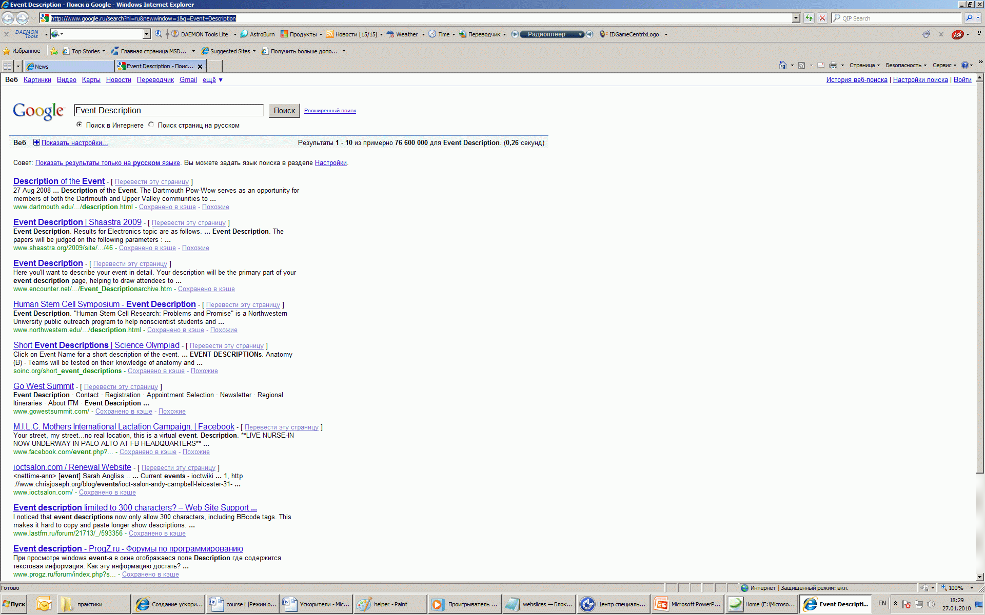 - Выбрав его, мы перейдем на страницу поисковой системы google с результатами запроса по выделенному нами фрагменту. Например выделим текст Event Descrition на странице News и выполним Поиск в Google