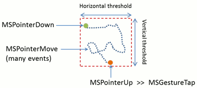 Различить события MSGestureTap и MSGestureHold позволяет временной порог (time threshold): MSGestureTap происходит, когда за событием MSPointerDown следует событие MSPointerUp в пределах временного порога.