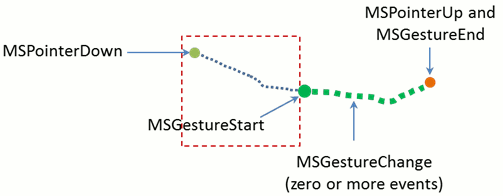События MSGestureStart, MSGestureChange, и MSGestureEnd все вместе задают манипуляцию (manipulation) для элемента, с которым связан жест, когда указатель контактирует с элементом в течение манипуляции. Технически это означает, что указатель больше не перемещается, когда он освобождается.