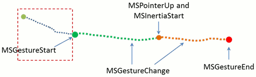Снова хочу отметить, что события жестов вызываются в ответ на последовательность событий указателя, предлагая высокоуровневую интерпретацию низкоуровневых событий указателя. В процессе интерпретации происходит дифференцирование событий касания/удержания от событий начала/изменения/окончания, выясняется, как и когда началось событие MSInertiaStart, и что предпринимает распознаватель жестов, когда объекту MSGesture передаются несколько точек.