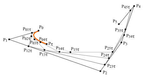 от 0 до 1 и для каждого находить точку таким образом, то мы получим кривую Безье n -го порядка, где n на 1 меньше числа точек (в данном случае порядок кривой будет пятый).