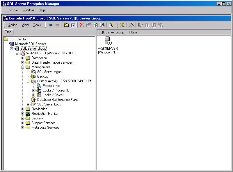 - В окне Enterprise Manager раскройте Microsoft SQL Server, раскройте SQL Server Group, раскройте сервер, раскройте папку Management и раскройте папку Current Activity (рис. 36.7). Папка Current Activity (Текущие операции) содержит три папки: Process Info (Информация о процессах), Locks/Process ID (Блокировки/Идентификаторы процессов) и Locks/Object (Блокировки/Объекты).