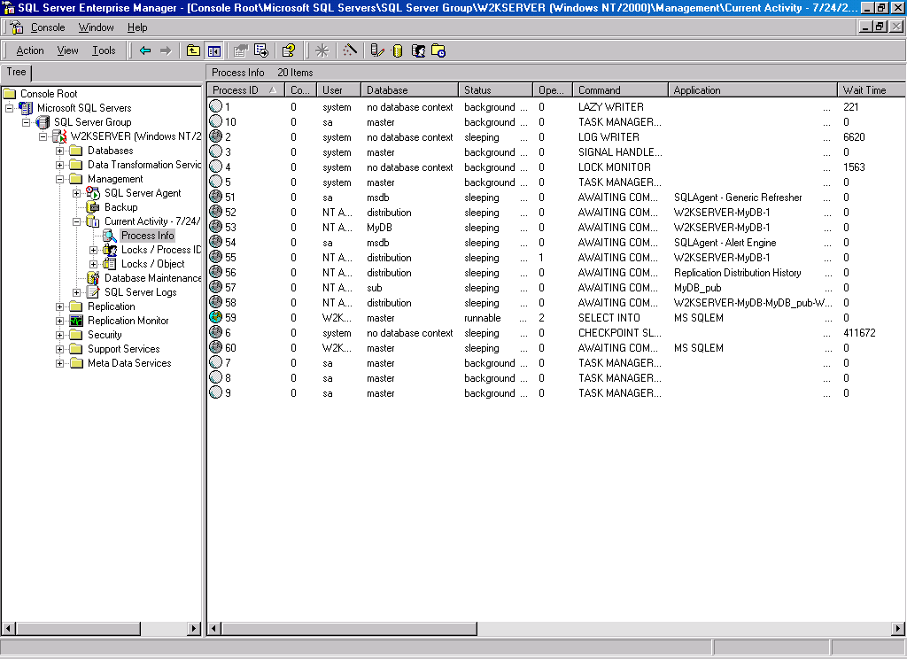 Рис. 36.8. Информация папки Process Info (Информация о процессах) в окне Enterprise Manager - Щелкните на папке Locks / Process ID для просмотра в правой панели списка системных идентификационных номеров процессов (SPID) для текущих активных процессов (рис. 36.9). Дважды щелкните на каком-либо из SPID-номеров в правой панели, чтобы появилось диалоговое окно Process Details (Подробности процесса) (рис. 36.10). В этом диалоговом окне показан последний оператор T-SQL, выполненный выбранным процессом.