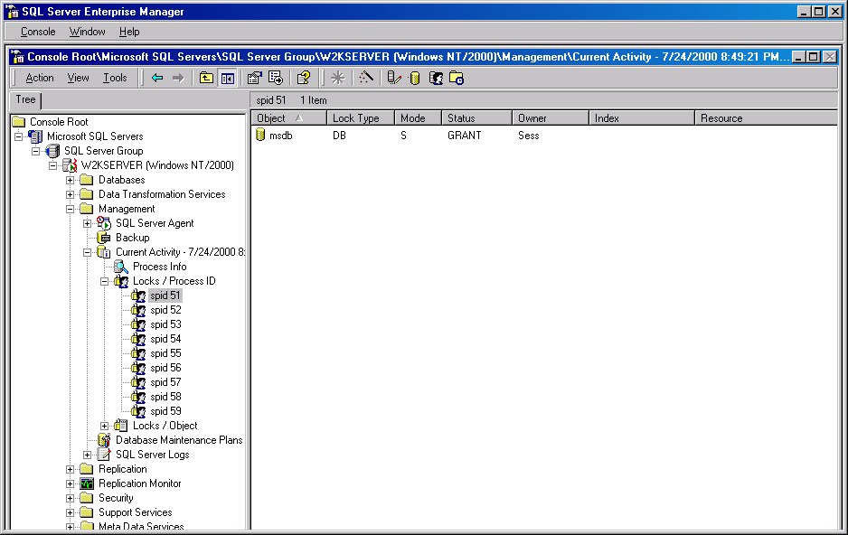 - Щелкните на каком-либо SPID-номере в левой панели, чтобы увидеть информацию о блокировках для этого процесса в правой панели (рис. 36.11). В эту информацию включен тип блокировки (Lock type), режим блокировки (Mode), состояние блокировки (Status) и владелец блокировки (Owner). Может быть указан один из следующих типов блокировки.