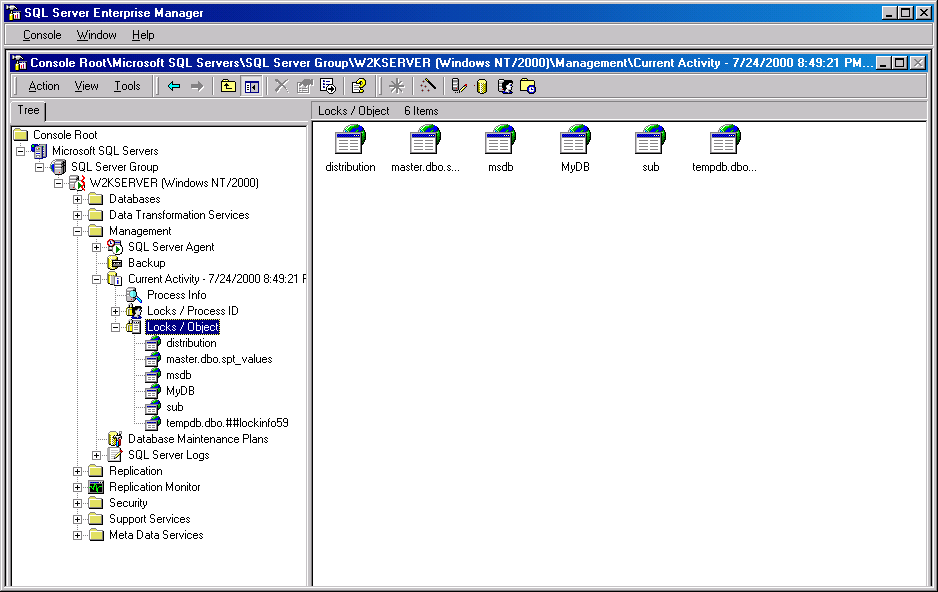 - Раскройте папку Locks / Object, чтобы увидеть список текущих блокированных объектов (рис. 36.12). Могут быть блокированы такие объекты, как таблицы, временные таблицы, базы данных и т.д.