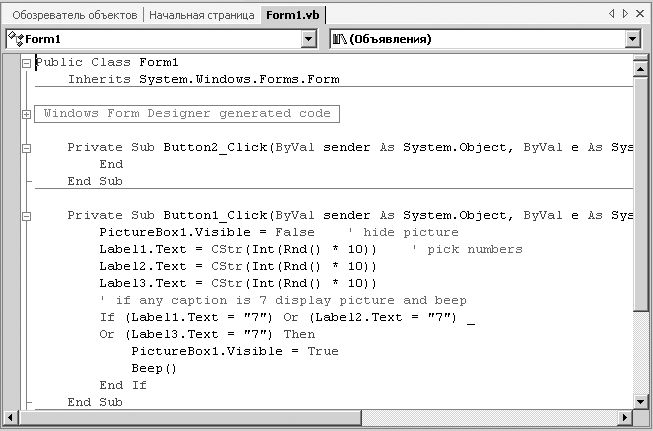 - Чтобы открыть проект, нажмите на ссылке "Семерка". Программа будет загружена и появится графическая форма. Если формы не видно, в Solution Explorer (Обозревателе решений) выберите Form1.vb, а затем нажмите кнопку Просмотреть конструктор. Теперь вы должны добавить в процедуру Form_Load - специальную процедуру, которая ассоциирована с формой и исполняется каждый раз при запуске программы - оператор Randomize.